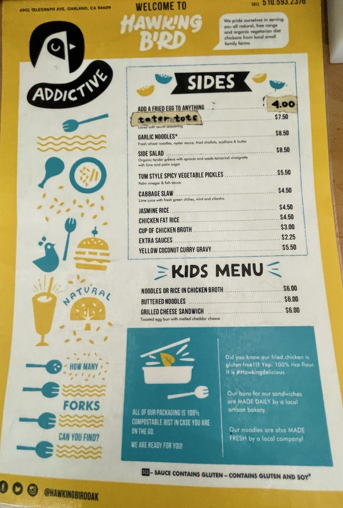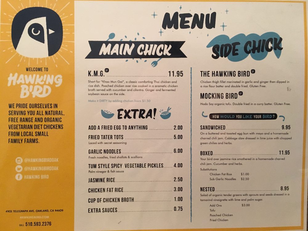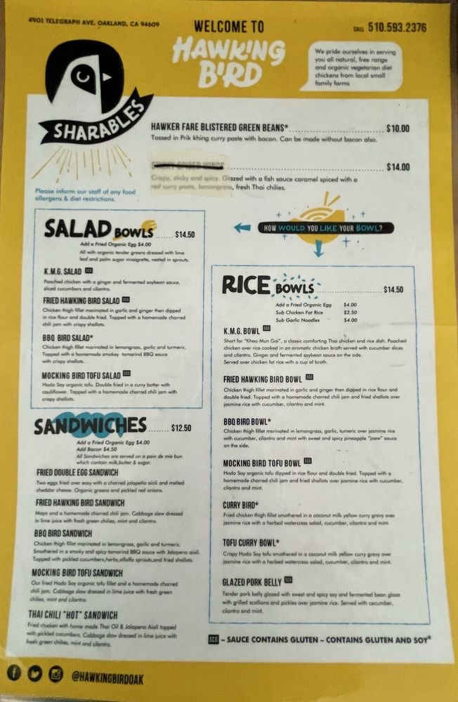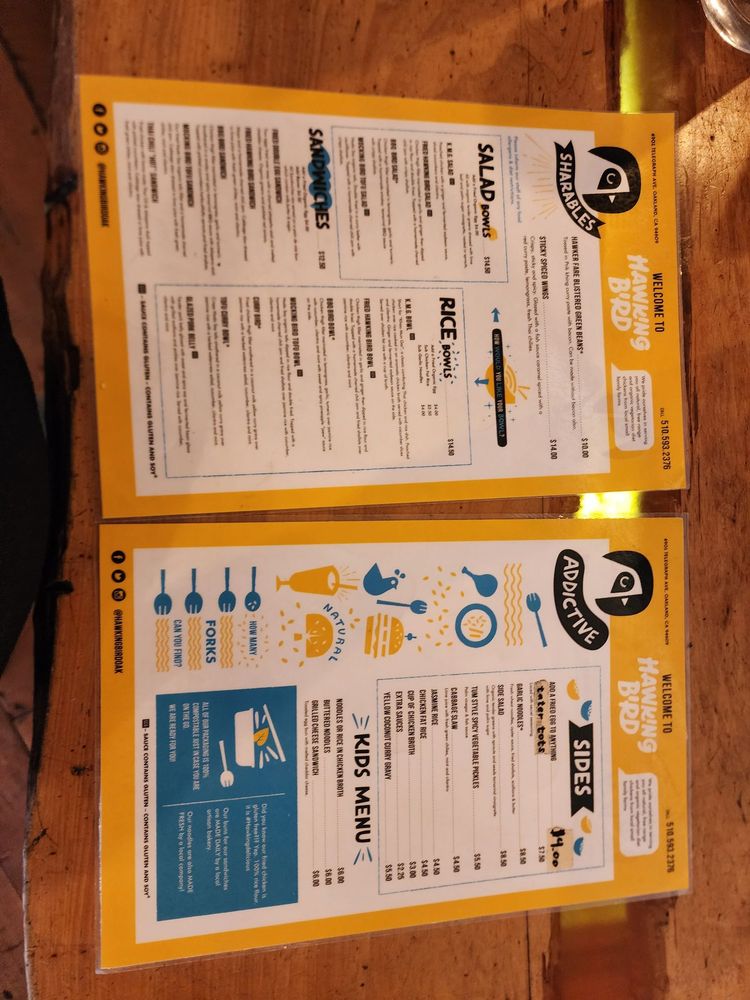 Welcome to Hawking Bird, a trendy and casual Asian Fusion restaurant located in Oakland, California. This Thai-inspired eatery offers a wide range of options, including vegan and limited vegetarian choices. With a focus on customer satisfaction, Hawking Bird provides delivery, takeout, and reservation services, catering to various dining preferences. Their diverse menu features dishes like pork belly bowls, chicken and rice, and Hainan-style chicken, all cooked with care and authenticity. Customers rave about the flavorful bone broth, delicious satay chicken, and refreshing Thai iced tea options. The restaurant's cozy atmosphere and efficient service make it a great spot for a quick meal or a relaxed dining experience. Hawking Bird truly stands out with its unique dishes and inviting ambiance, making it a must-visit for lovers of Asian cuisine.