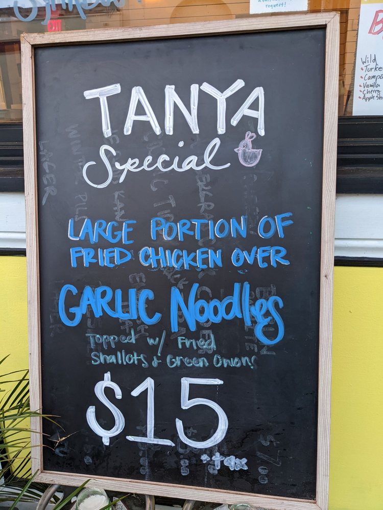 Large portion of fried chicken over garlic noodles topped with fried shallots and green onions, and a side of Chili Jam. This item contains gluten.